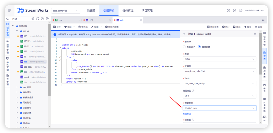 上个迭代已经支持了 OGG-JSON 的自动映射,本次迭代支持了实时平台自身采集工具打到 Kafka 的格式(ChunJun-json)。