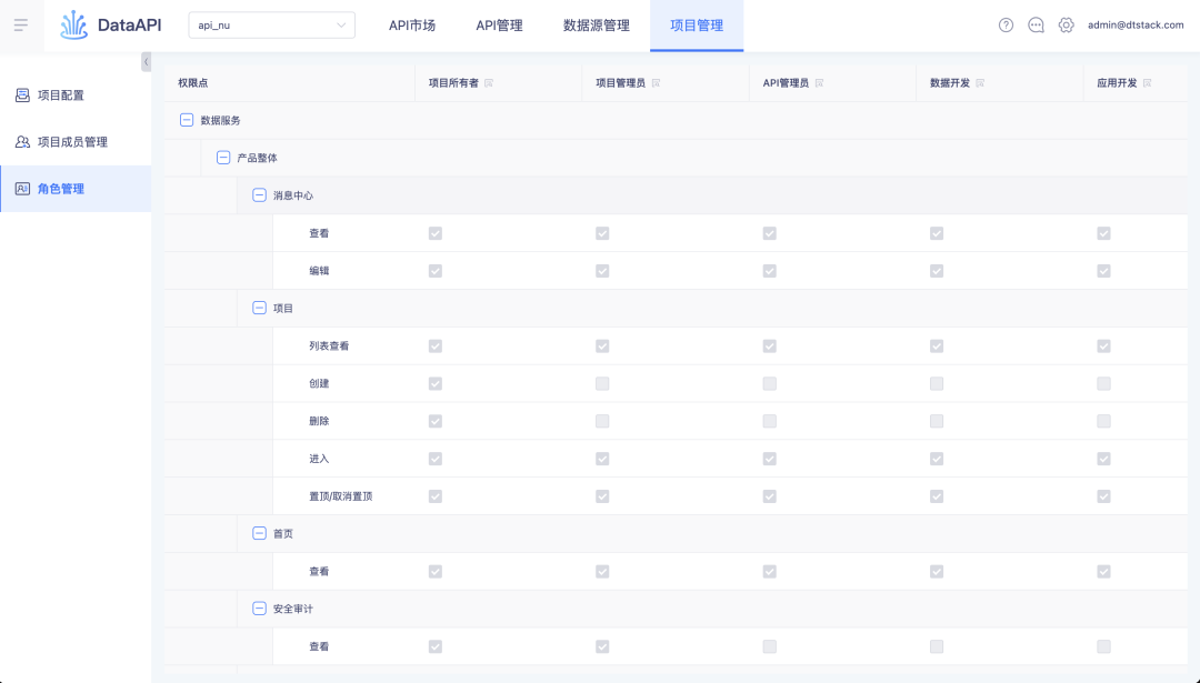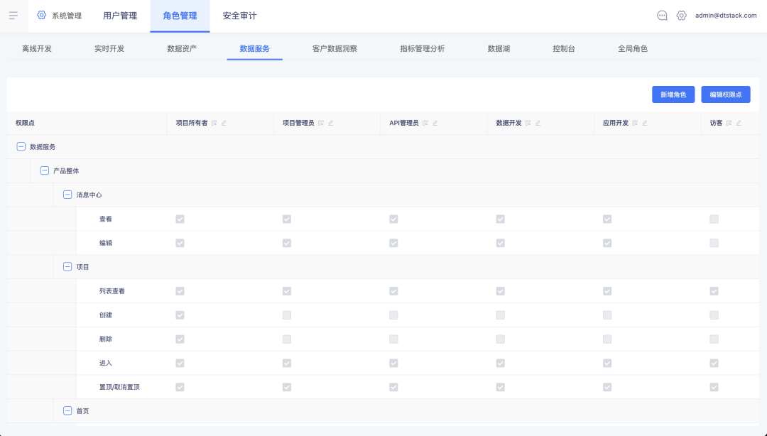 平台角色管理中,admin、租户所有者和租户管理员可在租户层为 API 创建自定义角色(可自由配置角色权限点),此角色创建后会在该租户的每个项目中存在。此外还可修改固定角色,如项目管理员、数据开发等的权限点。