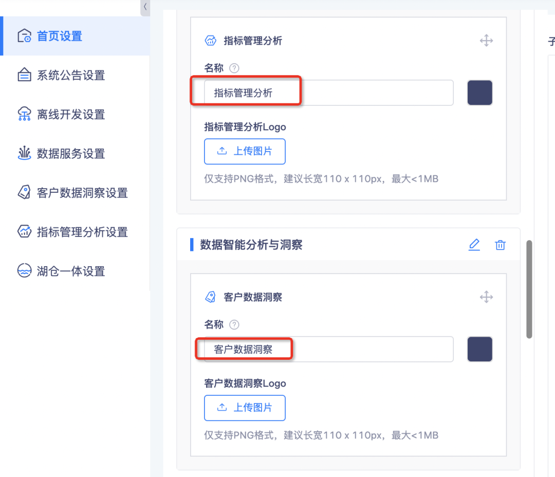 • 通过数栈首页进入「页面配置」界面,更新「首页设置」内的各功能模块的名称配置内容后,标签内部关于子产品名称的引用,将引用此处设置内容。首页设置内容如下: