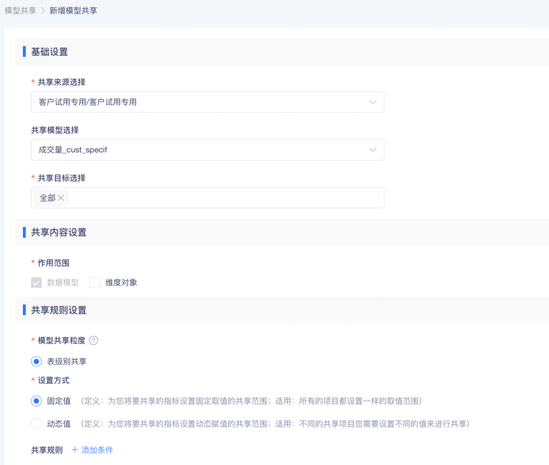 增加后,【第二步:设置共享条件】将针对每个单独的指标、模型设置共享条件,对于其中存在的共同的条件,可在第一步的公共维度共享规则中进行批量设置,最终共享规则将以第二步设置的内容为准。