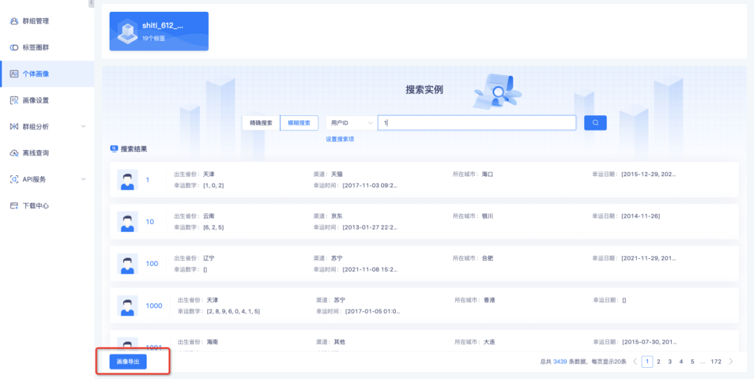 新增功能说明:进入个体画像页面,通过模糊/精确匹配显示搜索结果,点击「画像导出」可导出所有搜索结果。