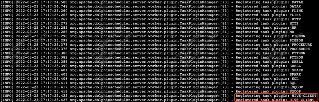 以上操作完成后,我们查看 worker 日志 tail -200f $Apache DolphinScheduler_HOME/log/Apache DolphinScheduler-worker.log