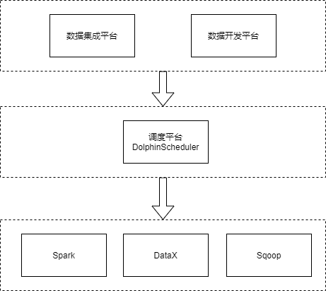 在我们公司的大数据离线任务调度架构中,调度平台处于中间层。用户通过数据集成平台提交数据同步任务给调度平台,通过数据开发平台提交工作流给调度平台。用户不和调度平台直接交互,而是和数据集成平台和数据开发平台交互(图1)。