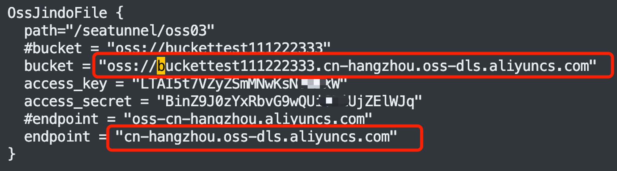 特别注意:如果是开通了 HDFS 的 OSS,有 2 个地方是不一样的:1 是 bucket,1 是 endpoint 。如下红色部分是开通了 HDFS 后的,被 “#” 注释掉的是未开通 HDFS 的情况。