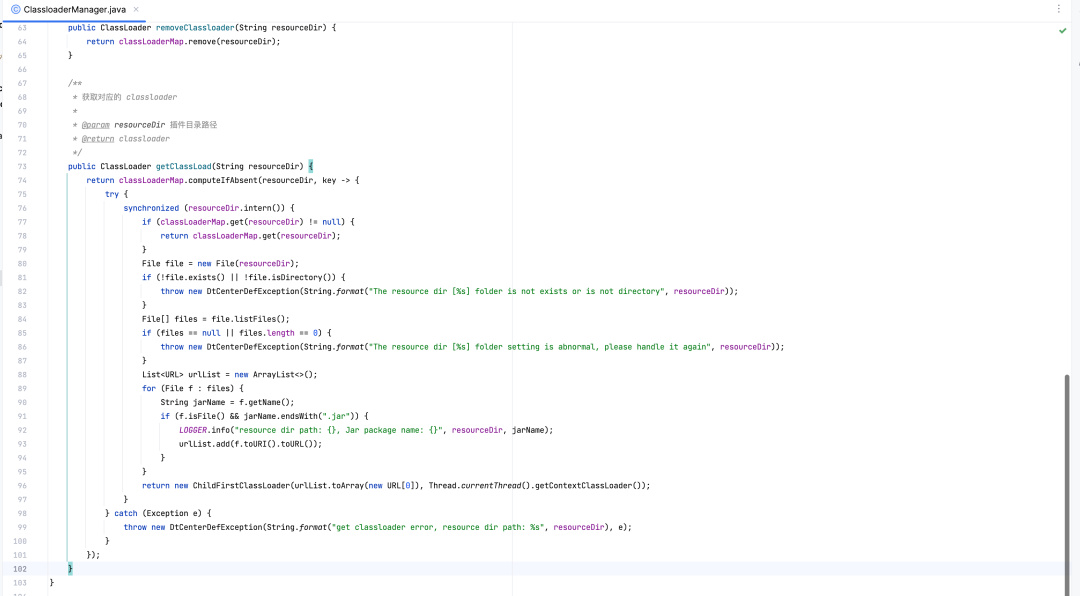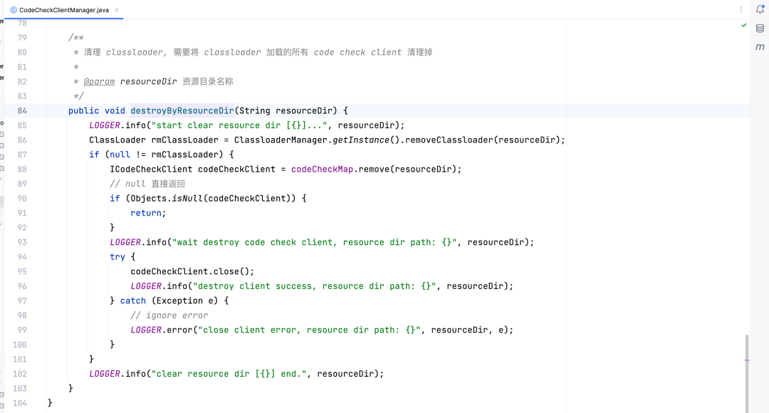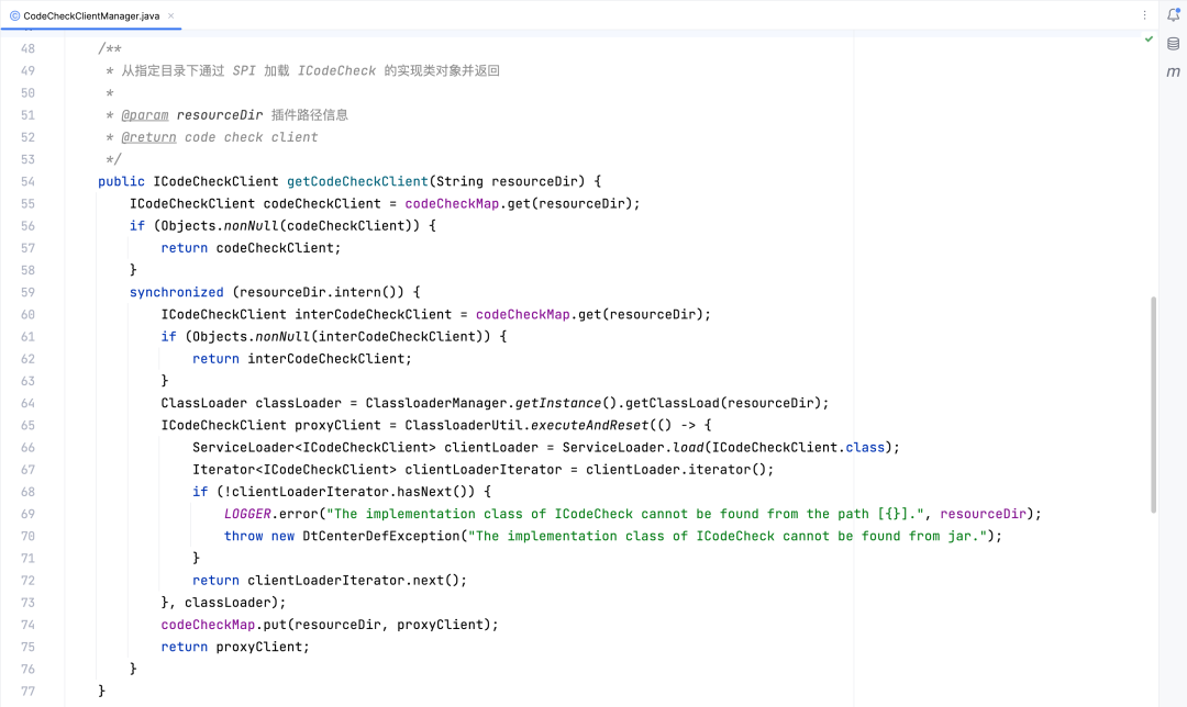 自定义代码检查规则使用 SPI 机制加载用户上传的自定义 jar,并在代码检测时调用 CodeCheck 方法,在资源关闭时调用 close 方法,用户需要将配置文件说明中的 jar 依赖自己的项目中。具体如下: