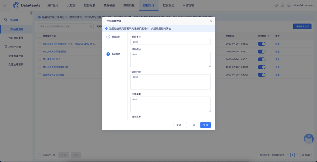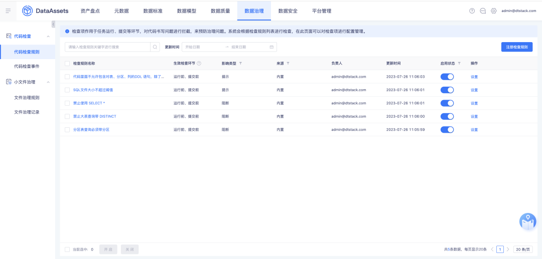 数据资产模块内置了 5 种代码检查规则,用户可以根据需要选择性开启。