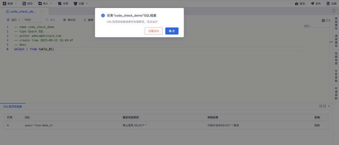 在离线 SQL 任务中去运行一条 SQL 前会根据选择的规则先进行代码检查,如果代码检查不通过则会反馈给用户,用户可以根据实际需要判断要不要执行该 SQL。