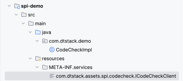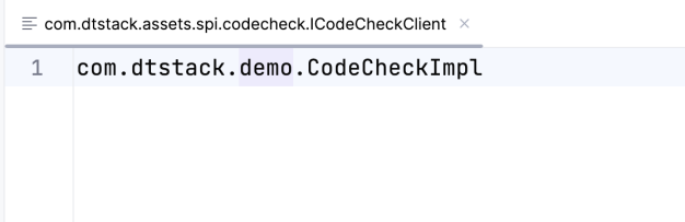 文件名称为 com.dtstack.assets.spi.codecheck.ICodeCheckClient ,文件内容为实现 ICodeCheckClient 接口类的权限定类名。