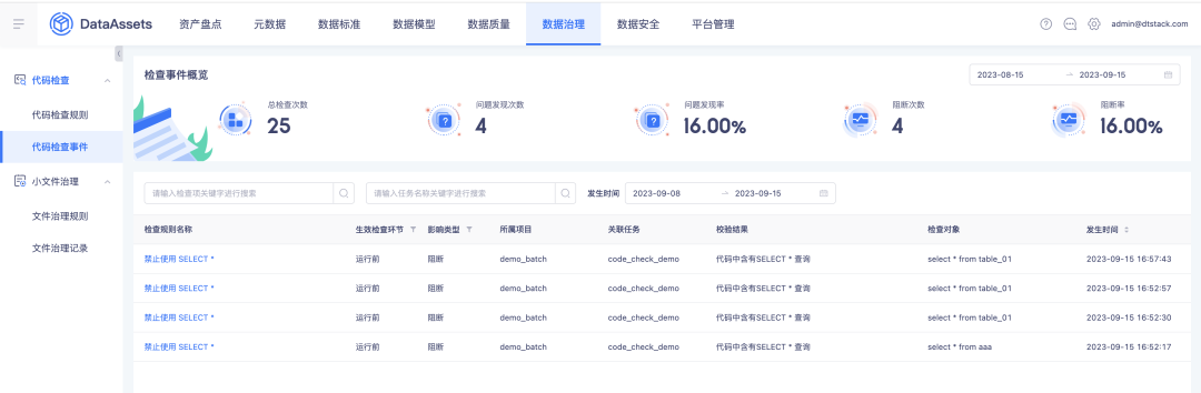 在数据资产的代码检查时间中可以看到已经触发的检查历史以及相应的统计数据。