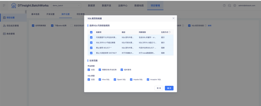 开启后在离线项目管理中可以选择使用的代码规则检查项、生效范围和 SQL 任务类型。