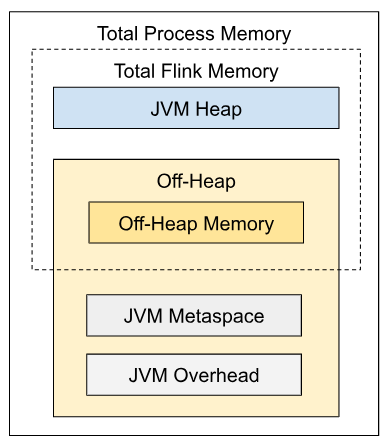 Flink JVM进程的总进程内存(total process memory)由Flink应用程序消耗的内存(总Flink内存(total Flink memory))和JVM运行进程所消耗的内存组成。总Flink内存消耗包括JVM堆内存( JVM Heap)和堆外(Off-heap,直接(direct)或本地(native)内存的使用量
