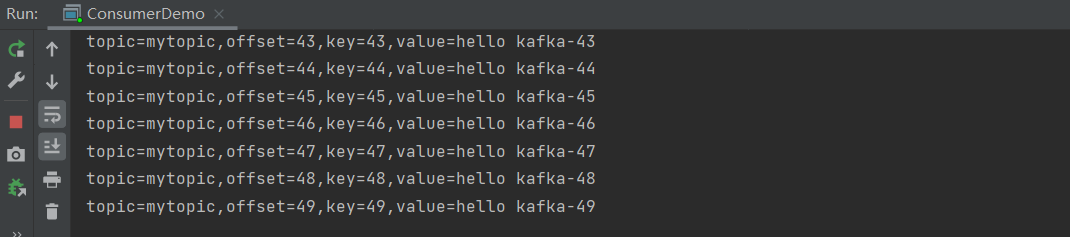 import org.apache.kafka.clients.consumer.ConsumerConfig; import org.apache.kafka.clients.consumer.ConsumerRecord; import org.apache.kafka.clients.consumer.ConsumerRecords; import org.apache.kafka.clients.consumer.KafkaConsumer; import java.time.Duration; import java.util.Collections; import java.util.Objects; import java.util.Properties; public class ConsumerDemo{ public static void main(String[] args) { Properties properties=new Properties(); properties.put(ConsumerConfig.BOOTSTRAP_SERVERS_CONFIG,"kafka01:9093,kafka02:9094,kafka03:9095"); properties.put("key.deserializer", "org.apache.kafka.common.serialization.StringDeserializer"); properties.put("value.deserializer", "org.apache.kafka.common.serialization.StringDeserializer"); //配置消费者组(必须) properties.put(ConsumerConfig.GROUP_ID_CONFIG,"group1"); properties.put("enable.auto.commit", "true"); // 自动提交offset,每1s提交一次 properties.put("auto.commit.interval.ms", "1000"); properties.put("auto.offset.reset","earliest "); properties.put("client.id", "zy_client_id"); KafkaConsumer<String, String> consumer = new KafkaConsumer<>(properties); // 订阅test1 topic consumer.subscribe(Collections.singletonList("mytopic")); while(true) { // 从服务器开始拉取数据 ConsumerRecords<String, String> records = consumer.poll(Duration.ofMillis(100)); if(Objects.isNull(records)){ continue; } for(ConsumerRecord<String,String> record : records){ System.out.printf("topic=%s,offset=%d,key=%s,value=%s%n", record.topic(), record.offset(), record.key(), record.value()); } } } }