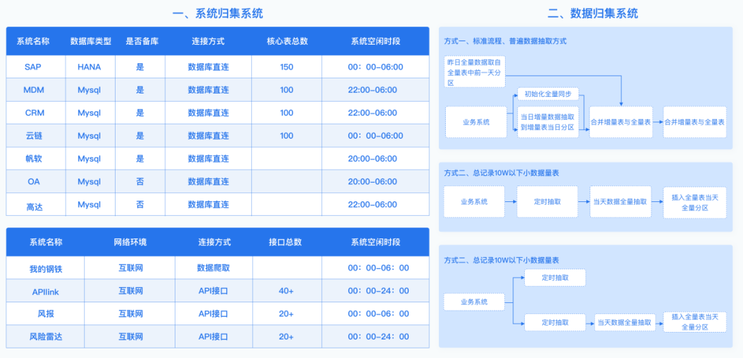 当前集团源端数据大体分为三类:第一种是传统业务数据,包含SAP系统、MDM系统、CRM系统、云链、高达、南北、OA等系统;第二种是第三方数据,包含船讯网、启信宝、行情数据、价格数据等;第三种是其他手工填报数据。