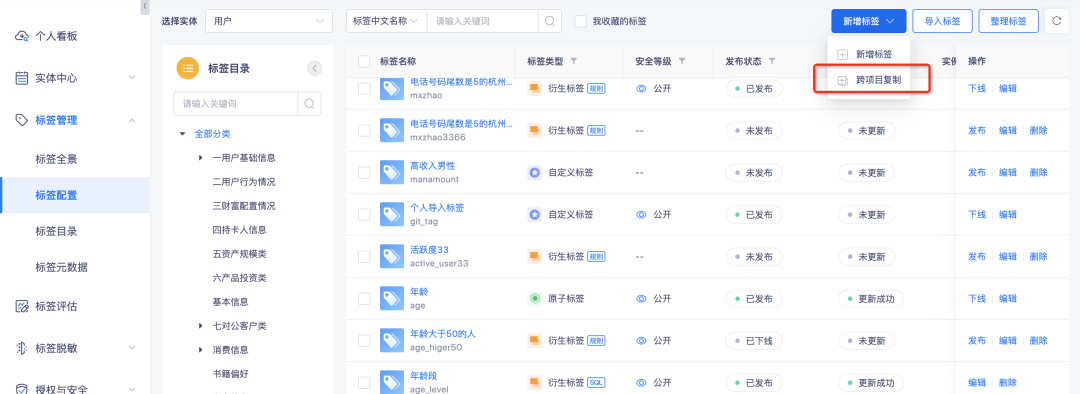 • 「新建标签」时可以通过「跨项目复制」将当前项目下其他实体或是其他项目的标签复制到当前实体下快速创建标签