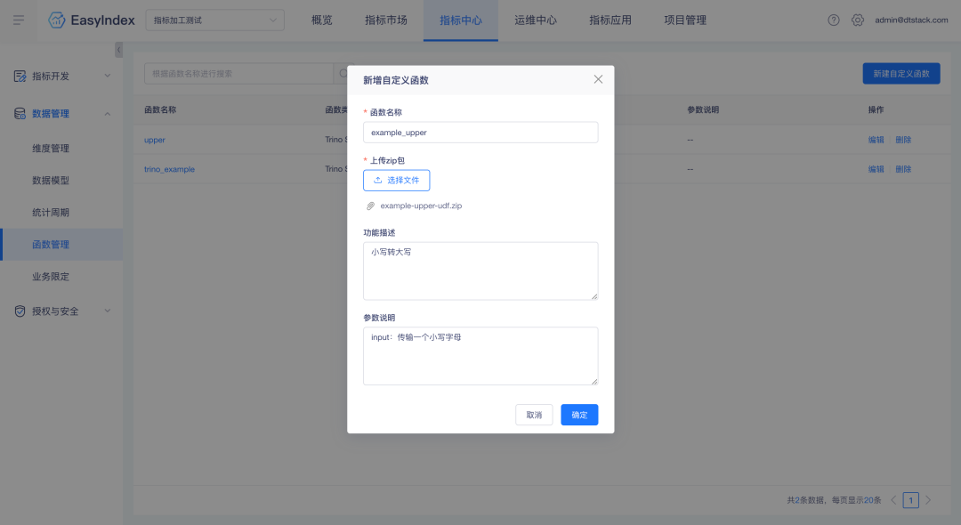 针对 Trino385 版本,可在「函数管理」模块创建 Trino 自定义函数,创建成功的自定义函数可在自定义指标中被引用。