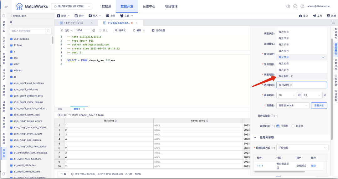 调度周期为“月”时,时间支持选择“每月最后一天”。