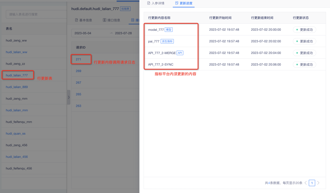 2)出参:模型/指标/API 针对所需表&所需请求批次的更新状态、表数据更新开始时间、表数据更新结束时间
