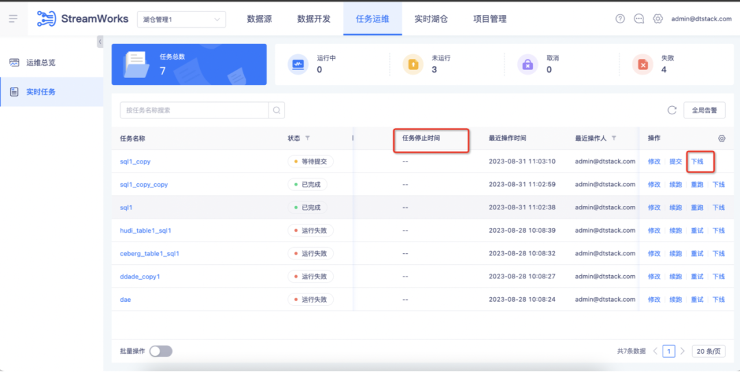 优化部分任务运维的交互体验,新增【任务下线】功能,在任务列表新增【任务停止时间】列。