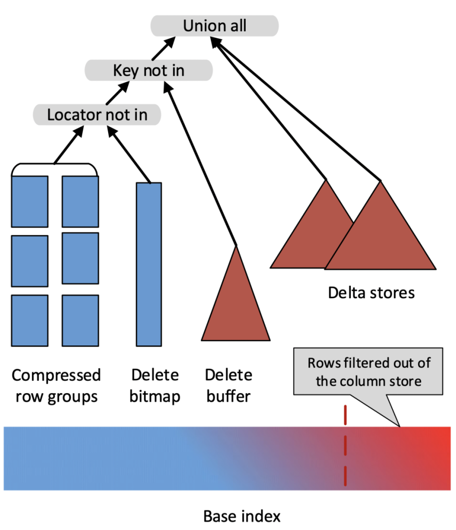 其优点是,任何一个有效的主键只存在于一个地方(要么在 Base Data 中,要么在 Delta Store 中),这样就避免了查询过程中的大量归并排序的消耗,同时 Base 数据中的各种丰富的列存索引也仍然有效。