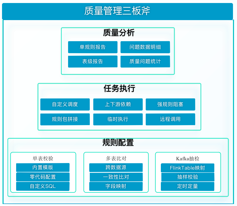 针对需要进行数据质量校验的数据表进行规则配置,平台内置标准的完整性、准确性、规范性、唯一性等规则模版,可实现免代码配置单表校验规则、多表比对规则,对于复杂场景同样支持自定义 SQL 进行规则配置,配置规则后进行任务执行,生成质量报告。