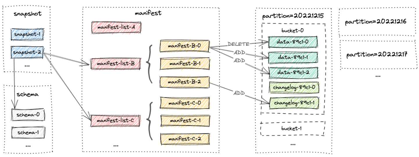 数据文件按分区和桶(Bucket)分组。每个Bucket目录都包含一个 LSM 树及其changelog文件。