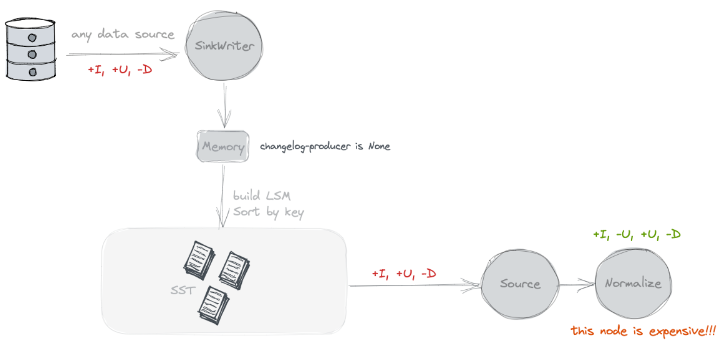 总而言之,没有一个changelog producer最适合数据库系统等使用者。 Flink 还有一个内置的”normalize”运算符,可以将每个键的值保留在状态中。 很容易看出,这种操作符的成本非常高,应该避免使用。 (可以通过“scan.remove-normalize”强制删除“normalize”运算符。)