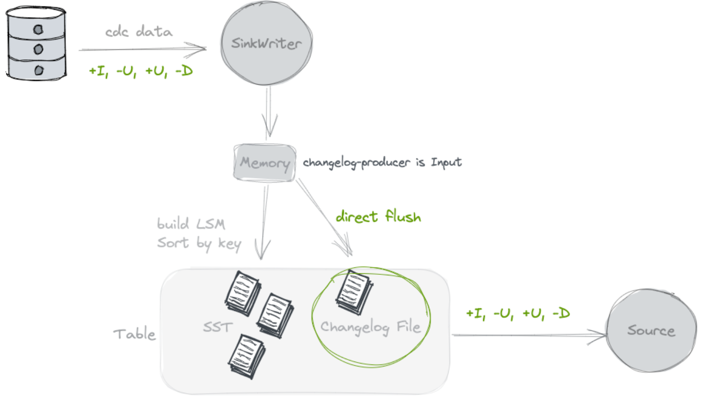 ,Paimon Writer依赖他们的输入作为完整changelog的来源。 所有输入记录将保存在单独的changelog file中,并由 Paimon source提供给消费者。