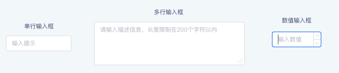 当用户输入的内容不可预测或自由度程度高时使用。使用单行文本框适用于输入文本字符数较少的场景;多行文本框适用于输入文本字符数较多时,可以选择使用拖拽文本框样式或⽂本⾃动撑⾼的功能。