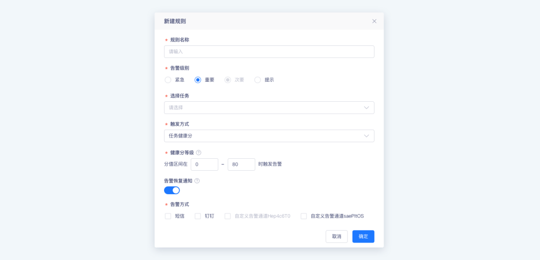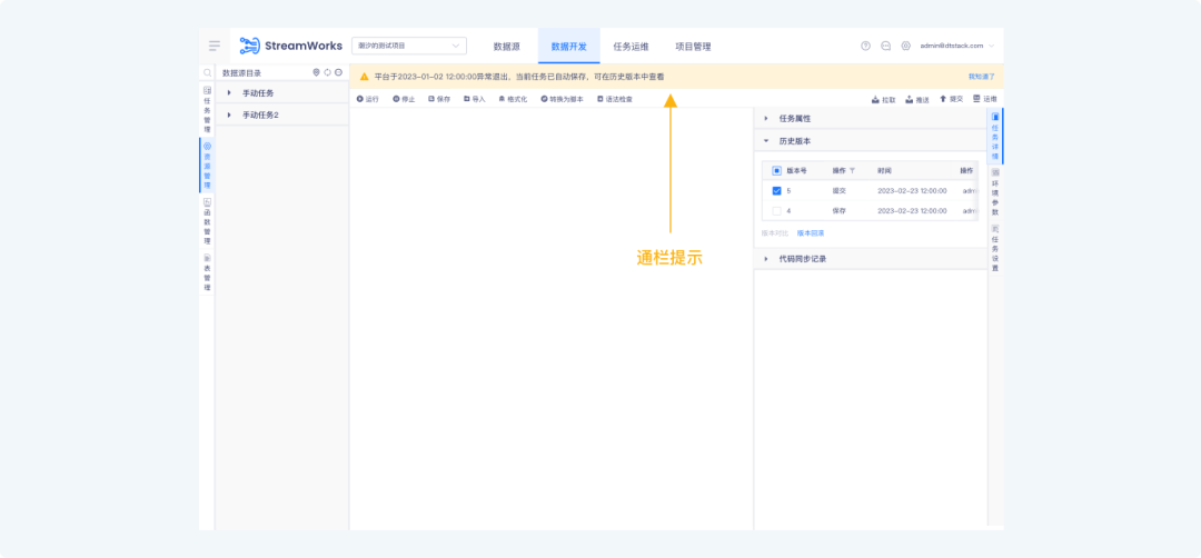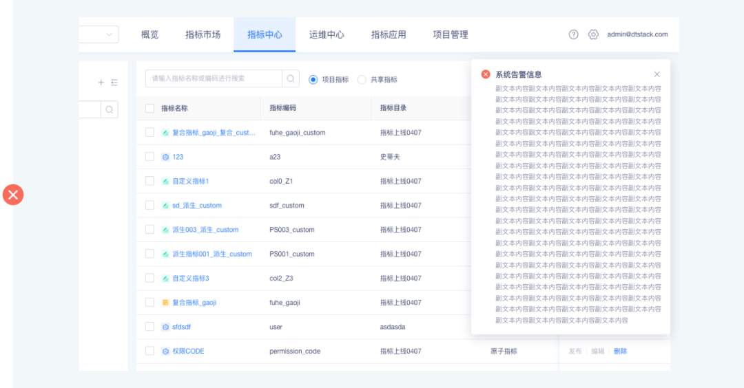 向⽤户反馈重要的警告提示和通知消息,⼀般显示在⻚⾯的右上⻆,可以⼿动关闭,也可以设置时间⾃动关闭,⽬前数栈产品内是在弹出⼏秒后⾃动关闭。