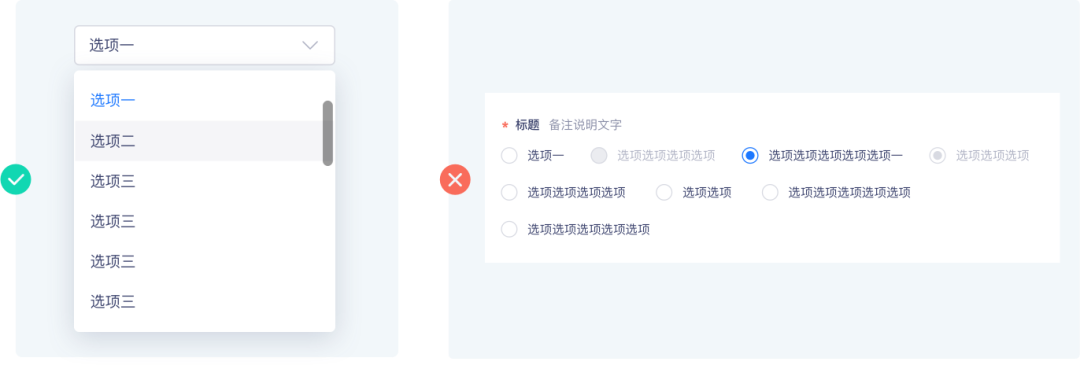 · 当选项⼤于5个以上时,使⽤选择器,保持洁⾯简洁,避免混乱