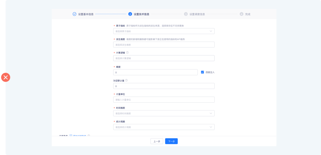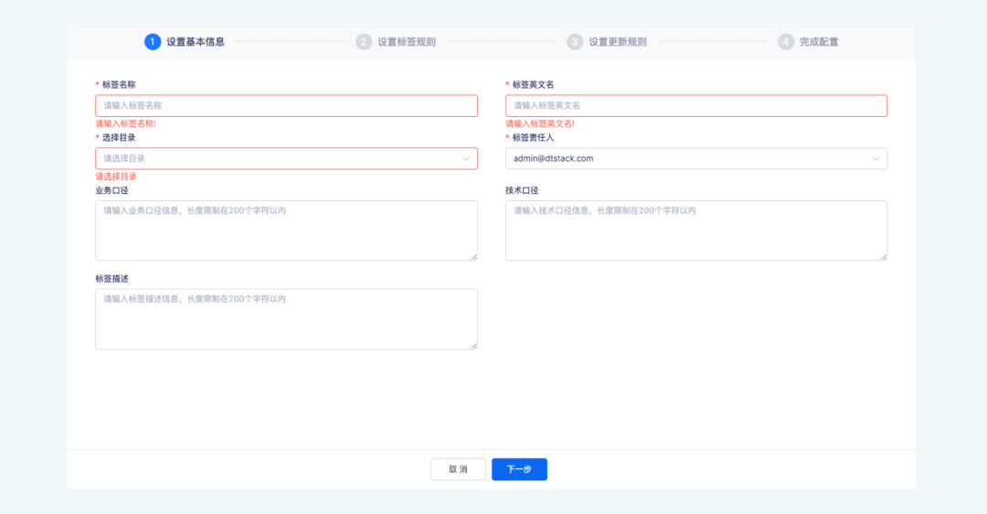 分步表单适⽤于内容较多,并且前后步骤之间存在线性关系的情况。在数栈产品中,⼀般步骤⻚的信息承载量普遍都会较⼤,按照纵向单列布局,导致⼀屏横向空间空⽩过多,纵向路径过⻓。所以为了确保信息的屏效⽐(⼀屏幕的内容曝光率),我们在做分布表单布局时,采⽤多列平铺的样式。