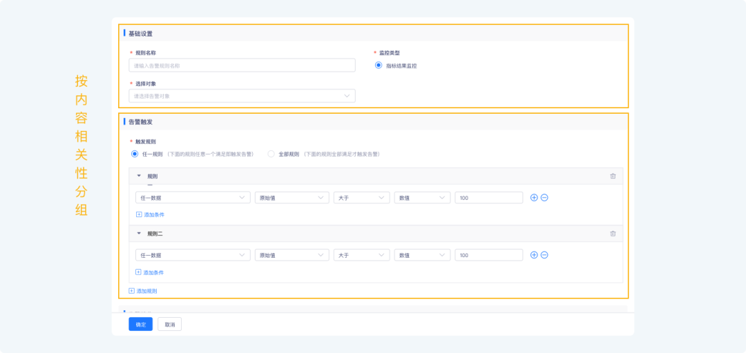 分组表单是按照一定相关性进行分组的表单,是遵循《简约至上-交互设计四策略》中提到的四⼤策略之⼀“组织”的应⽤。在基础平铺的基础上,将表单项中相关联的表单项进行分组,使表单显得更有规律和组织性。即使表单项较多,也不会显得杂乱无章,减轻了用户的心理压力和视觉疲劳,提高了操作体验。