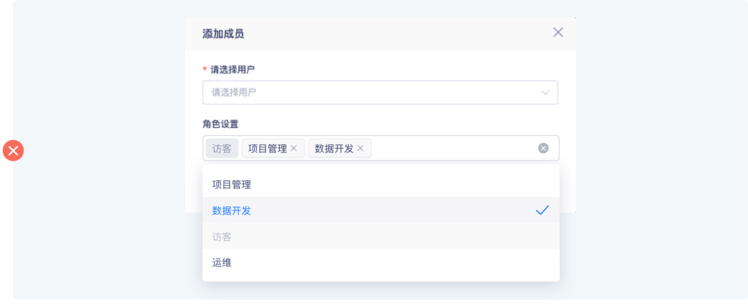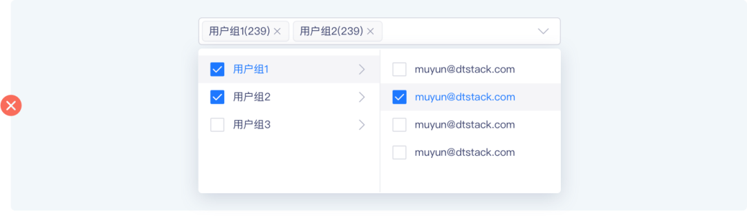 需要更清晰的展示选择内容时,穿梭框⽤直观的⽅式展示出了更多的选项信息,能够减少因信息隐藏造成的错误,⽅便⽤户实时了解选择的内容,增加⽤户的确定感。