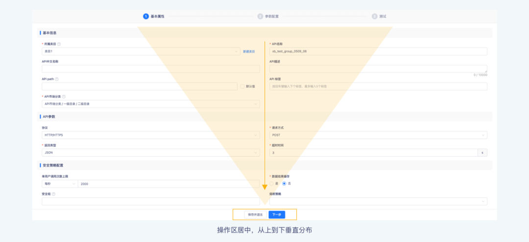 当表单内容分步时,步骤条位于⻚⾯中⼼,对应的操作按钮同样居中显示。垂直布局下,⽤户浏览时的眼动路径单纯向下,这种由上⾃下的浏览效率是最⾼的。因此,对应的主次关系布局应该遵循方向性原则,主按钮带有明确⽅向,具有下⼀步性质的按钮。