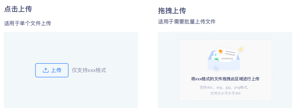 ⽤于传输⽂件或者提交相应的内容,⽬前数栈多数场景都是使⽤单个上传样式。