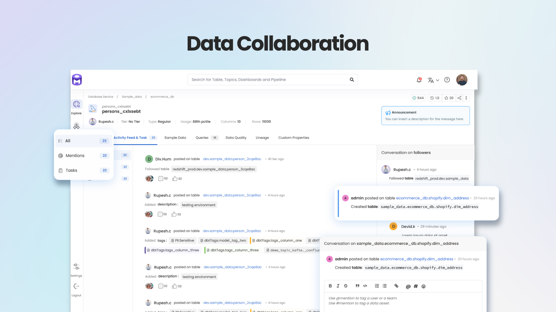 Openmetadata有搜索,数据血缘,数据质量,数据分析,标签,术语表功能,并且有团队协作的功能。