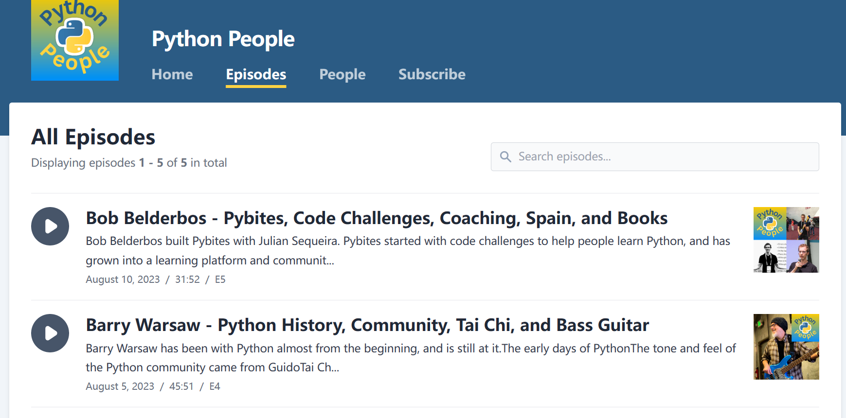 这是一档新上线一个月的播客栏目,每周访谈 Python 社区里一位有突出贡献的大佬。目前已访谈的嘉宾有 Michael Kennedy(Talk Python to Me 和 Python Bytes 的主理人)、Paul Everitt( JetBrains 和 PyCharm 的开发者倡导者)、Brett Cannon(Python 核心开发者)、Barry Warsaw(Python 核心开发者,非常早的成员)、Bob Belderbos(Pybites 的主理人)。