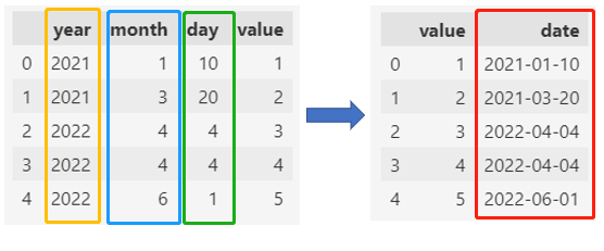 当收集来的数据中,年月日等信息分散在多个列时,往往需要先合并成日期类型,然后才能做分析处理。