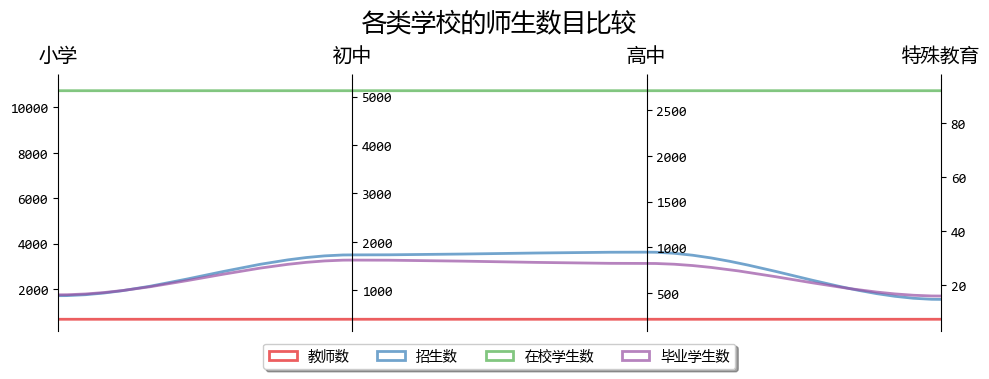 host.set_title("各类学校的师生数目比较", fontsize=18, pad=12)