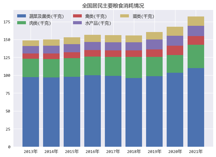 本次用堆叠柱状图统计最近几年全国居民消耗的主要几类粮食的情况。