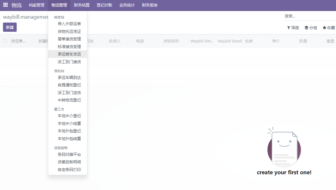 1 <?xml version="1.0" encoding="utf-8"?> 2 <odoo> 3 <menuitem name="物流" id="logistics_root" /> 4 5 <menuitem name="档案管理" id="archives_firstmenu" parent="logistics_root" sequence="1"/> 6 <menuitem name="货运" id="freight_secondmenu" parent="archives_firstmenu"/> 7 <menuitem name="客户分类管理" id="khflgl_thirdmenu" parent="freight_secondmenu" action="waybill_action"/> 8 <menuitem name="包装方式" id="bzfs_thirdmenu" parent="freight_secondmenu" action="waybill_action"/> 9 <menuitem name="货物档案" id="hwda_thirdmenu" parent="freight_secondmenu" action="waybill_action"/> 10 <menuitem name="保价费率" id="bjfl_thirdmenu" parent="freight_secondmenu" action="waybill_action"/> 11 <menuitem name="往来" id="dealings_secondmenu" parent="archives_firstmenu"/> 12 <menuitem name="运力分类管理" id="ylflgl_thirdmenu" parent="dealings_secondmenu" action="waybill_action"/> 13 <menuitem name="承运合同管理" id="cyhtgl_thirdmenu" parent="dealings_secondmenu" action="waybill_action"/> 14 <menuitem name="合作单位管理" id="hzdwgl_thirdmenu" parent="dealings_secondmenu" action="waybill_action"/> 15 <menuitem name="目的地名管理" id="mddmgl_thirdmenu" parent="dealings_secondmenu" action="waybill_action"/> 16 <menuitem name="内部" id="internal_secondmenu" parent="archives_firstmenu"/> 17 <menuitem name="内部公告管理" id="nbgggl_thirdmenu" parent="internal_secondmenu" action="waybill_action"/> 18 <menuitem name="部门职员设置" id="bmzysz_thirdmenu" parent="internal_secondmenu" action="waybill_action"/> 19 <menuitem name="异地网点配置" id="ydwdpz_thirdmenu" parent="internal_secondmenu" action="waybill_action"/> 20 <menuitem name="会计科目设置" id="kjkmsz_thirdmenu" parent="internal_secondmenu" action="waybill_action"/> 21 22 <menuitem name="物流管理" id="logistics_firstmenu" parent="logistics_root" sequence="2"/> 23 <menuitem name="始发站" id="start_secondmenu" parent="logistics_firstmenu" sequence="1"/> 24 <menuitem name="导入外部运单" id="drwbyd_thirdmenu" parent="start_secondmenu" action="waybill_action"/> 25 <menuitem name="货物托运凭证" id="hwtypz_thirdmenu" parent="start_secondmenu" action="waybill_action"/> 26 <menuitem name="简单接货受理" id="jdjhsl_thirdmenu" parent="start_secondmenu" action="waybill_action"/> 27 <menuitem name="标准接货受理" id="bzjhsl_thirdmenu" parent="start_secondmenu" action="waybill_action"/> 28 <menuitem name="承运装车发运" id="cyzcfy_thirdmenu" parent="start_secondmenu" action="waybill_action"/> 29 <menuitem name="派工到门接货" id="pgdmjh_thirdmenu" parent="start_secondmenu" action="waybill_action"/> 30 <menuitem name="目的站" id="destination_secondmenu" parent="logistics_firstmenu" sequence="2"/> 31 <menuitem name="承运车辆到达" id="cycldd_thirdmenu" parent="destination_secondmenu" action="waybill_action"/> 32 <menuitem name="自提通知登记" id="zttzdj_thirdmenu" parent="destination_secondmenu" action="waybill_action"/> 33 <menuitem name="派工到门送货" id="pgdmsh_thirdmenu" parent="destination_secondmenu" action="waybill_action"/> 34 <menuitem name="中转物流登记" id="zzwldj_thirdmenu" parent="destination_secondmenu" action="waybill_action"/> 35 <menuitem name="第三方" id="third_secondmenu" parent="logistics_firstmenu" sequence="3"/> 36 <menuitem name="本地中介登记" id="bdzjdj_thirdmenu" parent="third_secondmenu" action="waybill_action"/> 37 <menuitem name="本地中介结算" id="bdzjjs_thirdmenu" parent="third_secondmenu" action="waybill_action"/> 38 <menuitem name="本地外包登记" id="bdwbdj_thirdmenu" parent="third_secondmenu" action="waybill_action"/> 39 <menuitem name="本地外包结算" id="bdwbjs_thirdmenu" parent="third_secondmenu" action="waybill_action"/> 40 <menuitem name="货品控制" id="goods_control_secondmenu" parent="logistics_firstmenu" sequence="4"/> 41 <menuitem name="条码扫描平台" id="tmsmpt_thirdmenu" parent="goods_control_secondmenu" action="waybill_action"/> 42 <menuitem name="货差控制明细" id="hckzmx_thirdmenu" parent="goods_control_secondmenu" action="waybill_action"/> 43 <menuitem name="自定条码打印" id="zdytmdy_thirdmenu" parent="goods_control_secondmenu" action="waybill_action"/> 44 45 <menuitem name="财务结算" id="financial_firstmenu" parent="logistics_root" sequence="3"/> 46 <menuitem name="应收" id="receivable_secondmenu" parent="financial_firstmenu"/> 47 <menuitem name="客户运费结算" id="khyfjs_thirdmenu" parent="receivable_secondmenu" action="waybill_action"/> 48 <menuitem name="其他收入结算" id="qtsrjs_thirdmenu" parent="receivable_secondmenu" action="waybill_action"/> 49 <menuitem name="客户运费变动" id="khyfbd_thirdmenu" parent="receivable_secondmenu" action="waybill_action"/> 50 <menuitem name="应收余额清零" id="ysyeql_thirdmenu" parent="receivable_secondmenu" action="waybill_action"/> 51 <menuitem name="应付" id="payable_secondmenu" parent="financial_firstmenu"/> 52 <menuitem name="司机运费结算" id="sjyfjs_thirdmenu" parent="payable_secondmenu" action="waybill_action"/> 53 <menuitem name="车辆报销结算" id="clbxjs_thirdmenu" parent="payable_secondmenu" action="waybill_action"/> 54 <menuitem name="垫付运费结算" id="dfyfjs_thirdmenu" parent="payable_secondmenu" action="waybill_action"/> 55 <menuitem name="中转费用结算" id="zzfyjs_thirdmenu" parent="payable_secondmenu" action="waybill_action"/> 56 <menuitem name="接货费用结算" id="jhfyjs_thirdmenu" parent="payable_secondmenu" action="waybill_action"/> 57 <menuitem name="送货费用结算" id="shfyjs_thirdmenu" parent="payable_secondmenu" action="waybill_action"/> 58 <menuitem name="其他费用结算" id="qtfyjs_thirdmenu" parent="payable_secondmenu" action="waybill_action"/> 59 <menuitem name="货损赔款结算" id="hspkjs_thirdmenu" parent="payable_secondmenu" action="waybill_action"/> 60 <menuitem name="业务返款结算" id="ywfkjs_thirdmenu" parent="