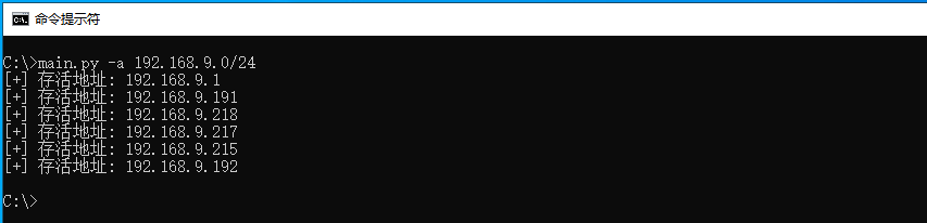 读者可自行运行上述程序片段,并传入main.py -a 192.168.9.0/24表示扫描整个C段,并输出存活主机列表,其中logging模块则用于指定只有错误提示才会输出,其他的警告忽略。扫描结果如下图所示;