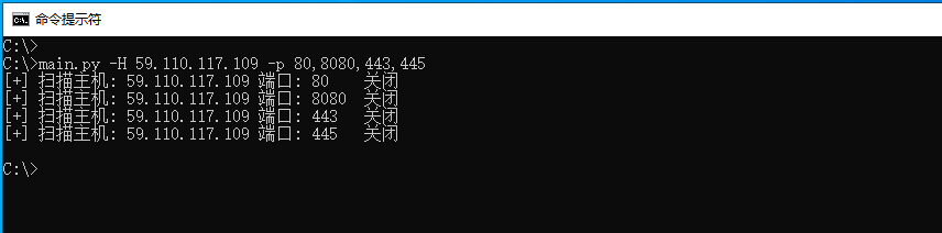 同理,我们分别传入被扫描主机IP地址以及需要扫描的端口号列表,当扫描结束后即可输出如下图所示的结果;
