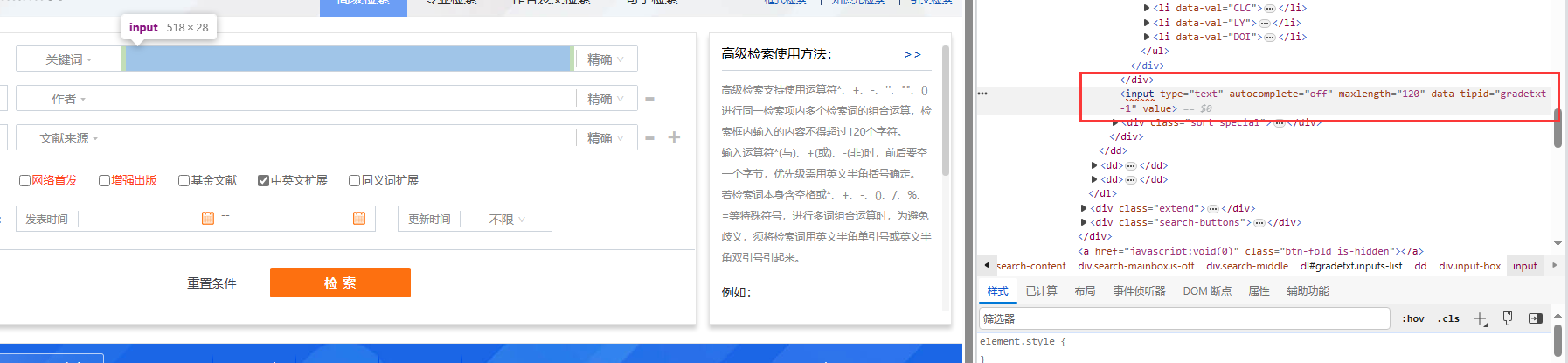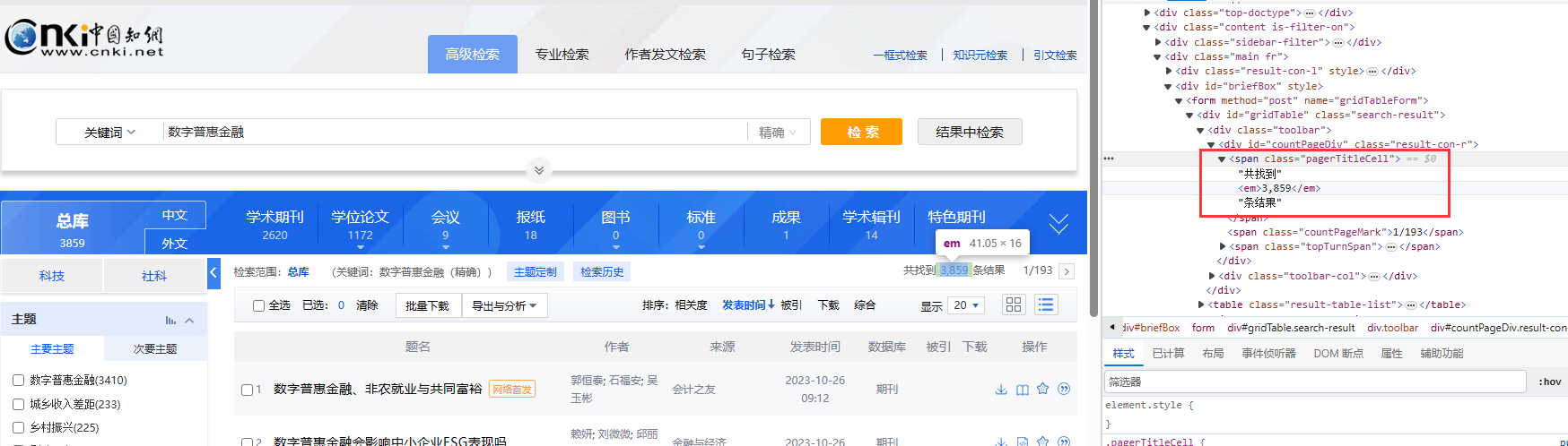 搜索结果出来之后定位【文献条数】,获取对应的条数(text 标签)