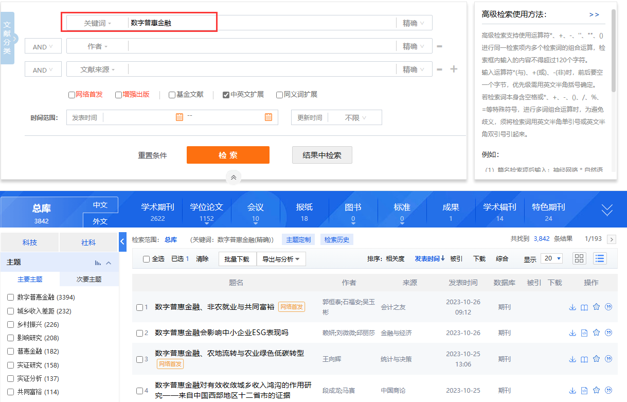 输入要搜索的关键词(例如:数字普惠金融)然后点击【检索】