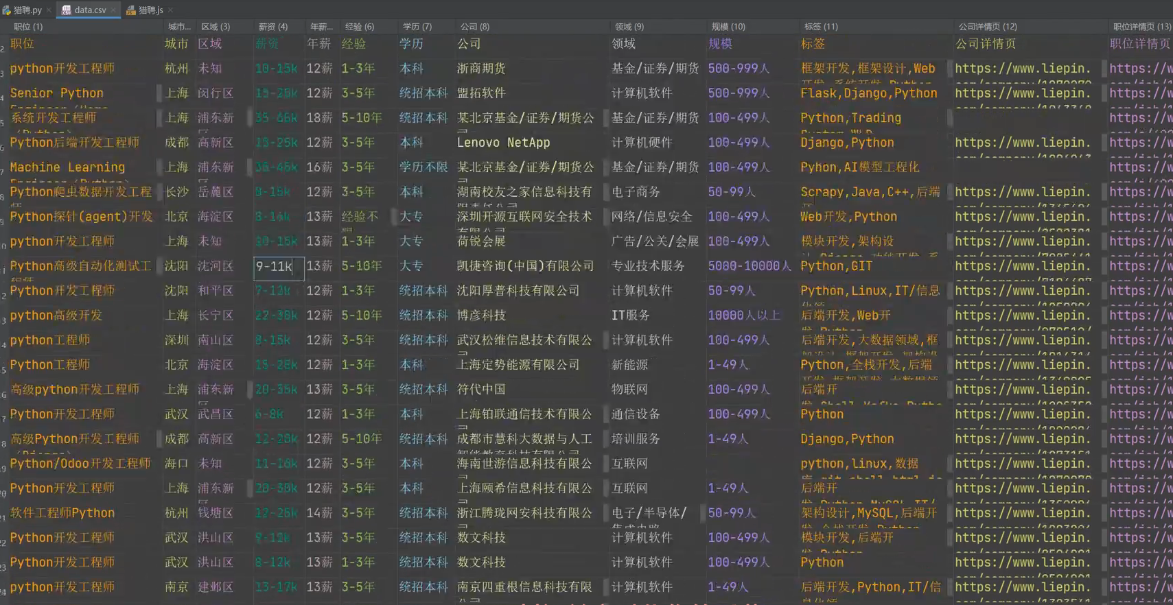 csv_file = open('data.csv', mode='w', encoding='utf-8', newline='') csv_writer = csv.DictWriter(csv_file, fieldnames=[ '职位', '城市', '区域', '薪资', '年薪', '经验', '学历', '公司', '领域', '规模', '标签', '公司详情页', '职位详情页', ]) # 完整代码和视频讲解我都打包好了 # 都放在这个抠裙了 708525271