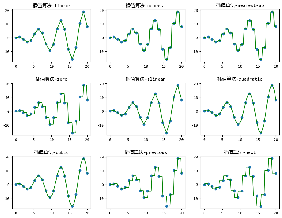 接下来,应用9种不同的插值算法将20个点补充为100个点,然后看看插值之后各种曲线的效果。