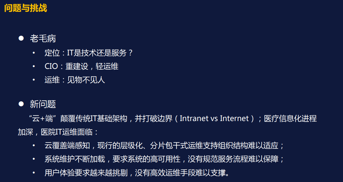 随着大数据、人工智能等技术融入医疗领域,医院信息化发展的下一阶段目标将是走向智慧医院,而智慧医院离不开大数据分析和数字化运维的支撑。由于医院数据的高商业以及敏感度,医院的信息中心必须确保信息系统的稳定运行,提升医院信息系统的服务质量。