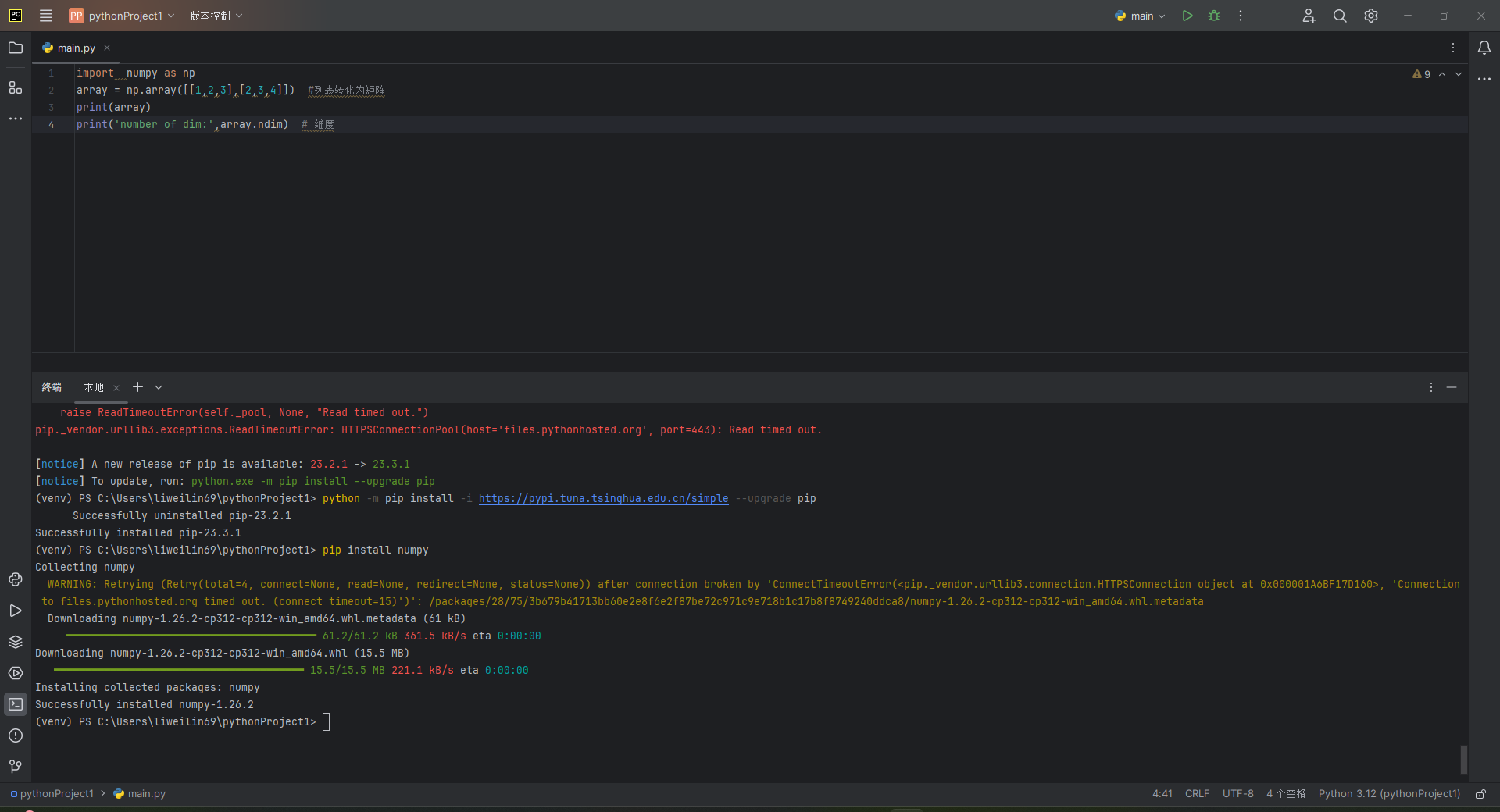 import numpy as np array = np.array([[1,2,3],[2,3,4]]) #列表转化为矩阵 print(array) print('number of dim:',array.ndim) # 维度