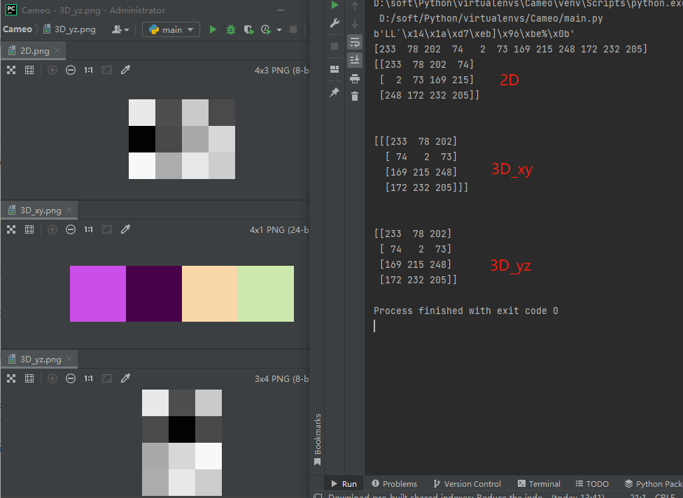 1 import cv2 2 import numpy 3 import os 4 5 # 生成随机字符,然后转换成字节数组 6 rb = bytearray(os.urandom(12)) 7 print(rb) 8 9 # 将字节数组转换成numpy数组 也可以直接使用numpy.random.randint(0, 256, 12)获取一个字节数组 10 fn = numpy.array(rb) 11 print(fn) 12 13 # 转换成灰度图,即二维数组 14 gi = fn.reshape(3, 4) 15 print(gi) 16 # cv2.imwrite('2D.png', gi) 17 18 # 转换成彩色图,即三维数组,此时的展示的面是 xy 构成的 19 bi = fn.reshape(1, 4, 3) 20 print(bi) 21 # cv2.imwrite('3D_xy.png', bi) 22 23 # 此时的展示的面是 yz 构成的 24 yz = numpy.uint8(bi[0, :, :]) 25 # cv2.imwrite('3D_yz.png', yz) 26 print(yz)